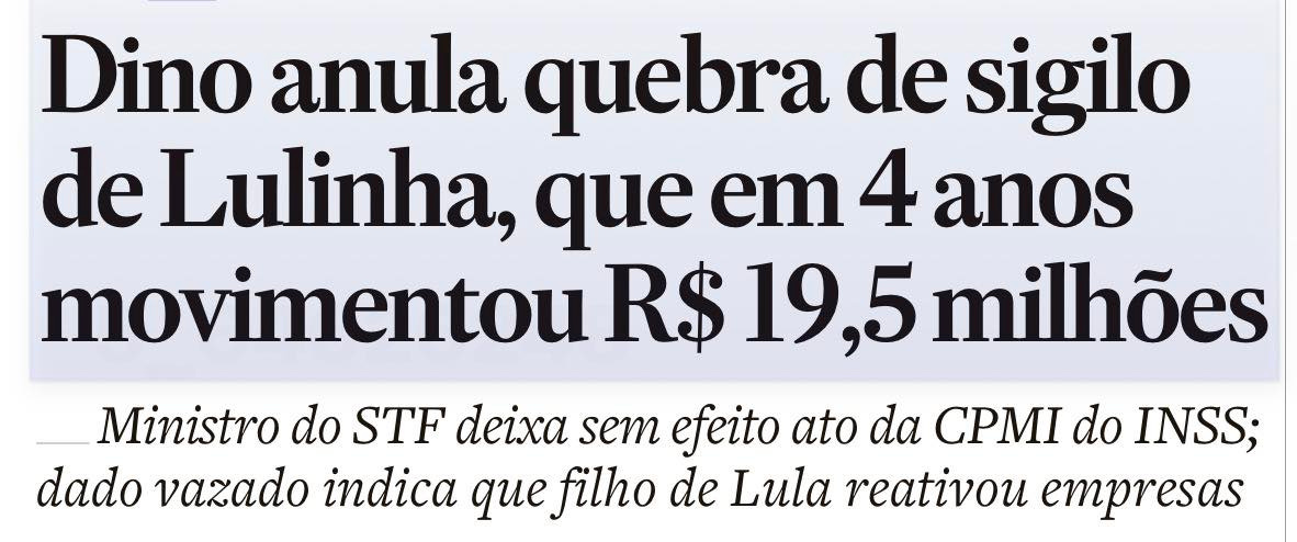 Ainda bem que, em um rompante de consciência cívica e democrática, o ministro Flávio STF-Futebol-Clube Dino derrubou a quebra de sigilo de Lulinha. Não fosse essa decisão, ficaríamos sabendo que Lulinha recebeu, limpos, quase R$ 2,5 milhões por ano.