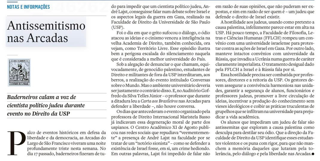 Tanto o caso da FFLCH, rompendo acordo com a Universidade de Haiffa, pelo o que escuto de uma conhecido que mora lá, é um das cidades mais democráticas e pluralista do Oriente Médio, onde Católicos, Muçulmanos, Judeus e ateus tem os filhos em algumas escolas e convivem juntos incluindo a participação dos pais. Outro absurdo é o caso do Largo São Francisco proibir alguém de falar. Sou egresso da USP nos anos 80. Lá assisti palestras e papos com Delfin Neto, Fernando Henrique, Florestan Fernandes etc. Havia manifestantres contra o palestrante, mas todos falavam e quem não os apoiava nem comparecia. A universidade é um campo de discussão de ideias e não de lacração. Uma vergonha!