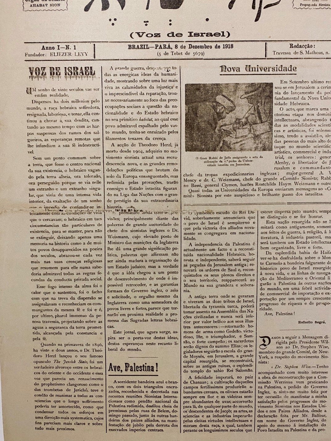 Em visita ao Museu Judaico de São Paulo, tirei uma foto da primeira página de um curioso jornal, Voz de Israel, editado em Belém do Pará, com data de 8/12/1918, logo após o fim da 1ª Guerra Mundial.