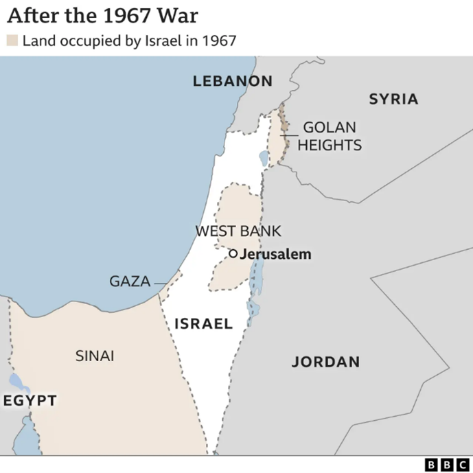 A coisa começa a ficar confusa após a Guerra dos Seis Dias, que ocorreu entre 5 e 10/06/1967. É nesta guerra que Israel toma a Faixa de Gaza e a Península do Sinai do Egito, a Cisjordânia (incluindo Jerusalém Oriental) da Jordânia e as colinas do Golã da Síria, conforme o mapa a seguir:
