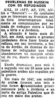Trecho de uma reportagem do Estadão em 10/06/1967, reproduzido a seguir, retrata essa situação na Jordânia, que se via novamente como o destino do êxodo de árabes que viviam na Palestina em virtude da guerra. Note como a matéria se refere aos palestinos como “palestinos árabes”, ou seja, árabes que viviam no antigo território da Palestina, e não como “palestinos”.