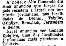 Note como a Cisjordânia (West Bank) aparece como um território “ocupado pela Jordânia”. Trata-se de um território que deveria ser o Estado árabe estabelecido na Palestina, mas que se tornou, na prática, parte da Jordânia. A notícia abaixo, publicada no dia 07/06/1967, segundo dia da Guerra dos Seis Dias, cita várias cidades da Cisjordânia como sendo jordanianas.