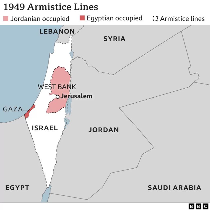 A chamada “Guerra da Independência” de Israel terminou em março do ano seguinte, com Israel não só conseguindo defender o seu próprio território, como conquistando partes dos territórios antes destinados a ao Estado árabe na região segundo a partilha proposta pela ONU. Podemos ver a seguir o mapa com a chamada linha de armistício de 1949, ou linha verde, uma linha que será relembrada periodicamente pela ONU em suas resoluções após a Guerra dos Seis Dias. Ou seja, este território conquistado na Guerra da Independência foi reconhecido pela ONU como território de Israel, sobre isso não há disputa.