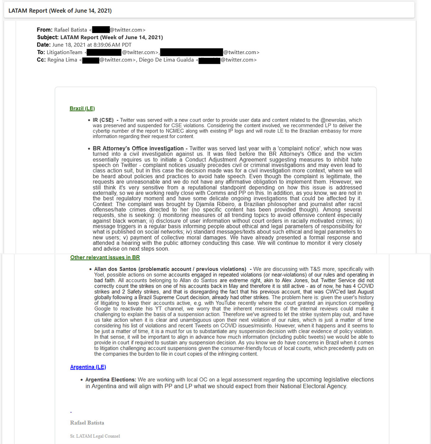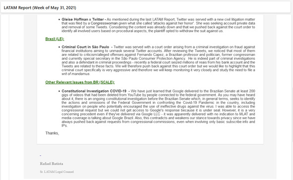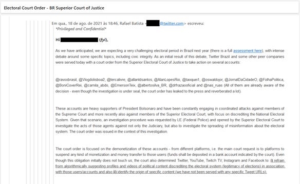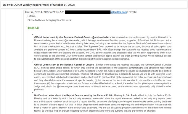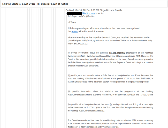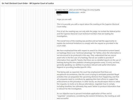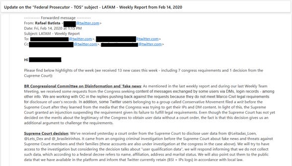 O primeiro e-mail data de 14/02/2020. Neste e-mail, o então responsável pela área jurídica LATAM do então Twitter, Rafael Batista (que sairia da empresa em fevereiro de 2022) reporta pressão do Congresso brasileiro para que divulgasse conteúdo de mensagens diretas e informações de logins de certas contas. A Suprema Corte concedeu liminar ao Twitter para barrar esses pedidos.