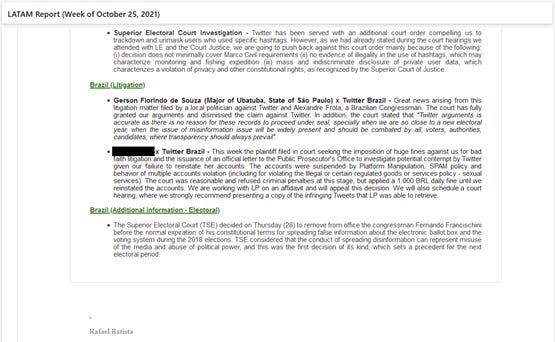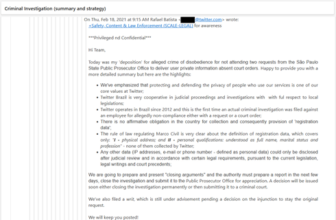 2) O Twitter foi informado de uma investigação criminal a respeito de não cumprimento de ordem judicial durante as eleições municipais de 2020, e o pedido da justiça pelo nome da pessoa dentro da empresa que está conduzindo o processo. Rafael afirma que a ordem foi cumprida, depois de um apelo judicial e que, portanto, a nova investigação não teria objeto. Portanto, não haveria motivo para entregar qualquer nome, e estaria trabalhando com um advogado criminal para fazer a apelação.