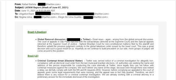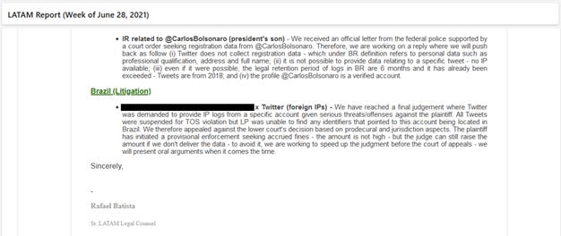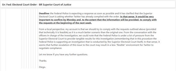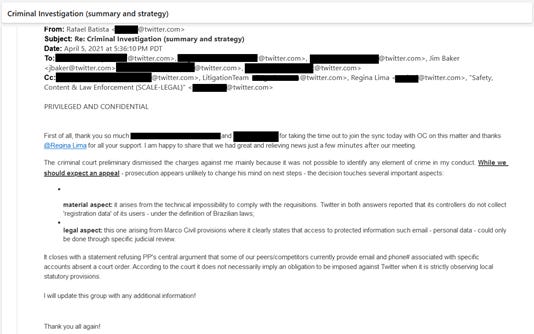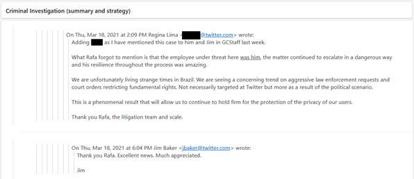 Uma colega, Regina Lima (que saiu do Twitter em dez/2022), e que na época desse e-mail era Head do Legal Internacional, responde ao e-mail do Rafael no mesmo dia, congratulando-o e afirmando que o Brasil estava vivendo “tempos estranhos”, por conta dos pedidos do judiciário brasileiro. A hora do e-mail de Regina é anterior ao do e-mail do Rafael, mas pode ser um problema de fuso horário, talvez estivessem em escritórios diferentes. Jim Baker, então o número 2 do departamento jurídico do Twitter, se junta à conversa agradecendo ao Rafael.