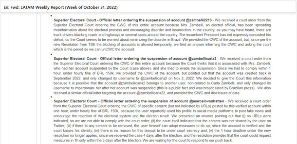 2) Outra intimação para suspensão de conta, desta vez de @zambellicarla2, pois o TSE achou que se tratava da mesma pessoa tentando evadir da ordem de suspensão (item anterior). A empresa cumpriu a determinação, mas alertou o TSE de que essa conta havia sido criada em set/2022 e apenas mudara o seu nome para @zambellicarla2 em 02/11/2022, o que poderia ser um indício de que a conta pertenceria a outra pessoa, que apenas aproveitou a suspensão de Zambelli para incorporar o seu nome. (Também a conta @zambellicarla22 foi suspensa por ordem judicial.)