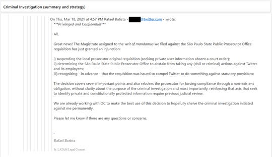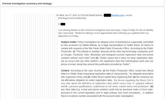 O segundo e-mail já pula para o dia 27/01/2021, quase um ano depois. O mesmo Rafael Batista diz que a Procuradoria do Estado de São Paulo o está processando por desobediência a ordem judicial. Segundo Rafael, a Procuradoria teria dito que 1) as outras redes sociais teriam compartilhado dados pessoais de suas contas sem uma ordem judicial e 2) que a informação de que o Twitter não tem os dados pessoais (e-mail e telefone) é absurda. Rafael afirma que, segundo o Marco Civil da Internet, os únicos dados pessoais são o endereço físico, nome completo, estado marital e profissão, e estes dados não são coletados pelo Twitter. Outros dados, somente com ordem judicial. O caso refere-se a um perfil supostamente ligado ao crime organizado.
