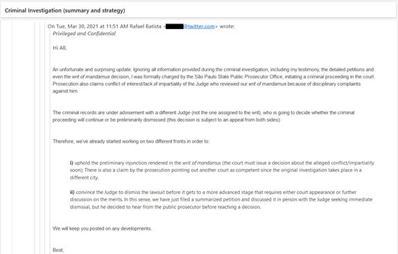 Doze dias depois, em 30/03/2021, Rafael volta a escrever, desta vez com notícias ruins: a Procuradoria de São Paulo, ignorando a decisão judicial, havia iniciado um processo criminal contra ele, alegando que o juiz era parcial em função de reclamações disciplinares contra ele.