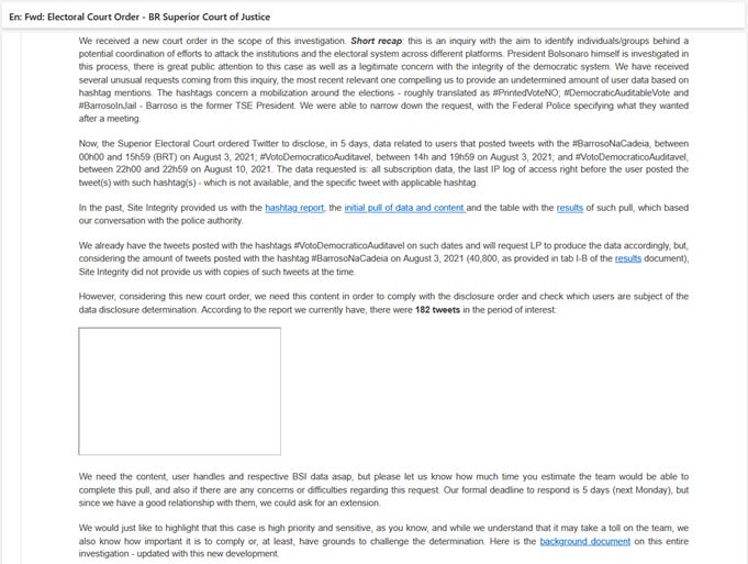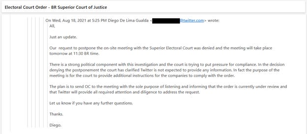 Há dois e-mails do dia 18/08/2021, aparentemente não relacionados. O primeiro (pelo horário) é de Diego de Lima Gualda, que havia entrado no Twitter em junho daquele ano e está na empresa até hoje. Segundo seu Linkedin, é Head do Legal Internacional. Diego relata a tentativa infrutífera de não comparecer a uma reunião presencial com o TSE no dia seguinte. Ele estressa o “caráter político” da investigação, mas não fica claro, no e-mail, qual seria essa investigação. Shullenberger afirma que este e-mail é resposta ao posterior que veremos a seguir, mas o horário é anterior, a não ser que Gualda esteja nos EUA. De qualquer modo, esses e-mails não parecem estar relacionados.