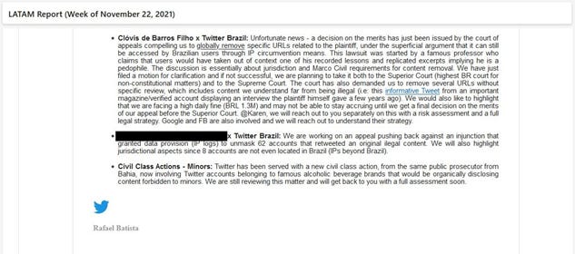1) Trata-se de uma ação do professor Clóvis de Barros Filho para a retirada global de conteúdo do ar. Rafael lamenta que tenham perdido em 2ª instância, e diz que vai até o STF com o caso, mas a multa diária é de R$1,3 milhões. A questão do Twitter, novamente, é que entende que a retirada não está contemplada no Marco Civil da Internet.